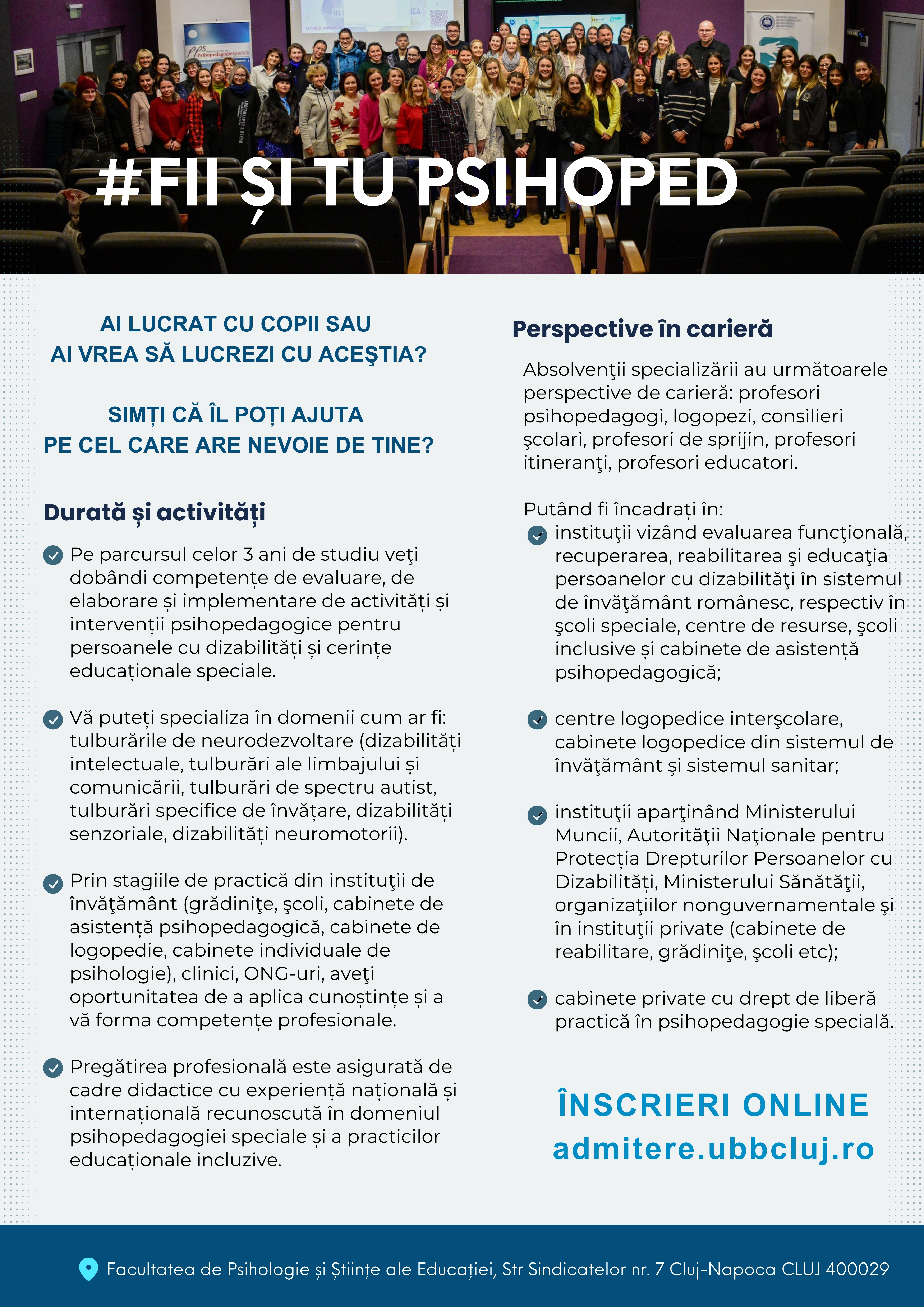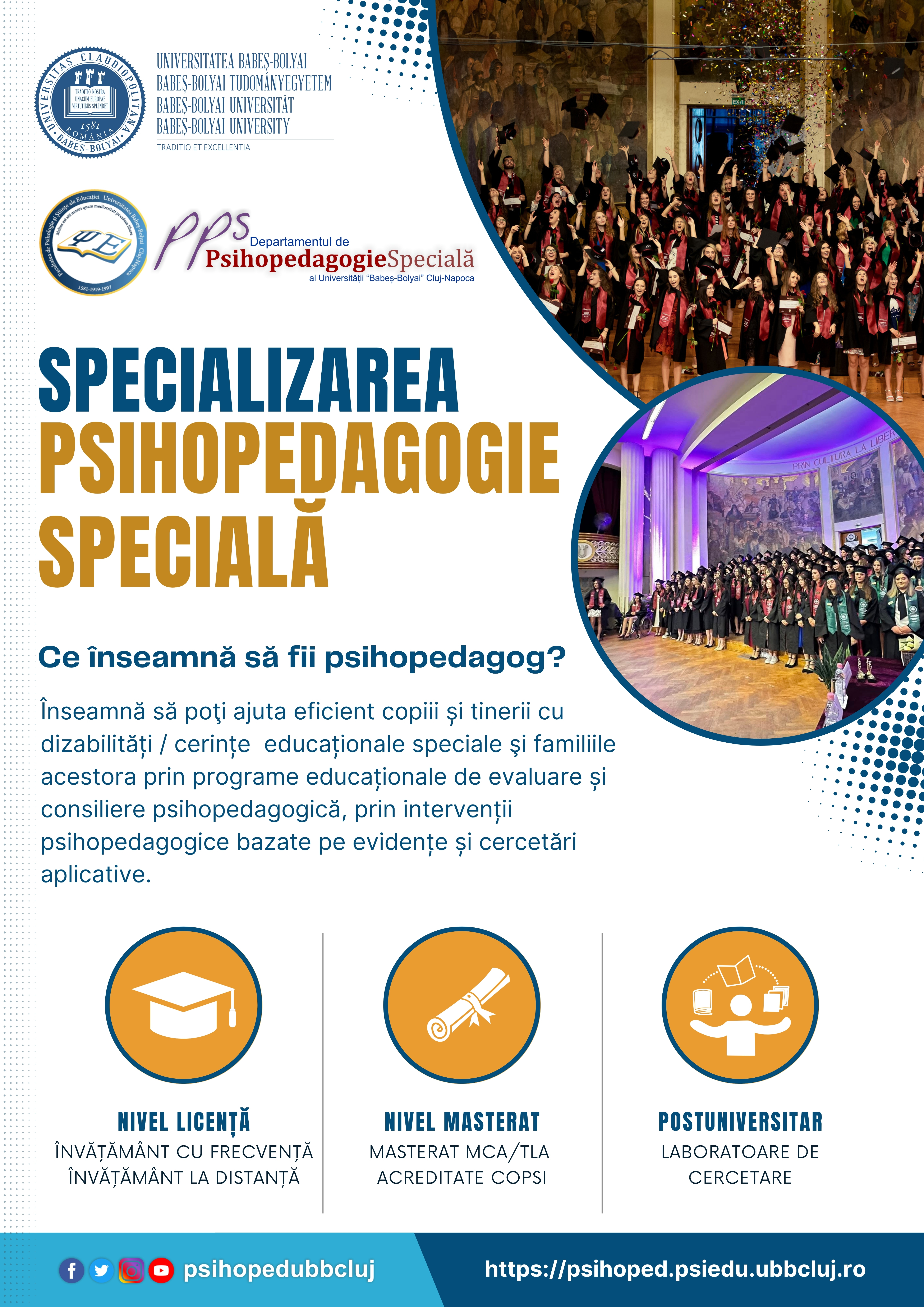 Specializare de tradiţie a şcolii universitare clujene, Psihopedagogia Specială este un domeniu interdisciplinar care pregăteşte specialişti în domeniul intervențiilor psihopedagogice și pentru educarea şi recuperarea persoanelor cu dizabilităţi.