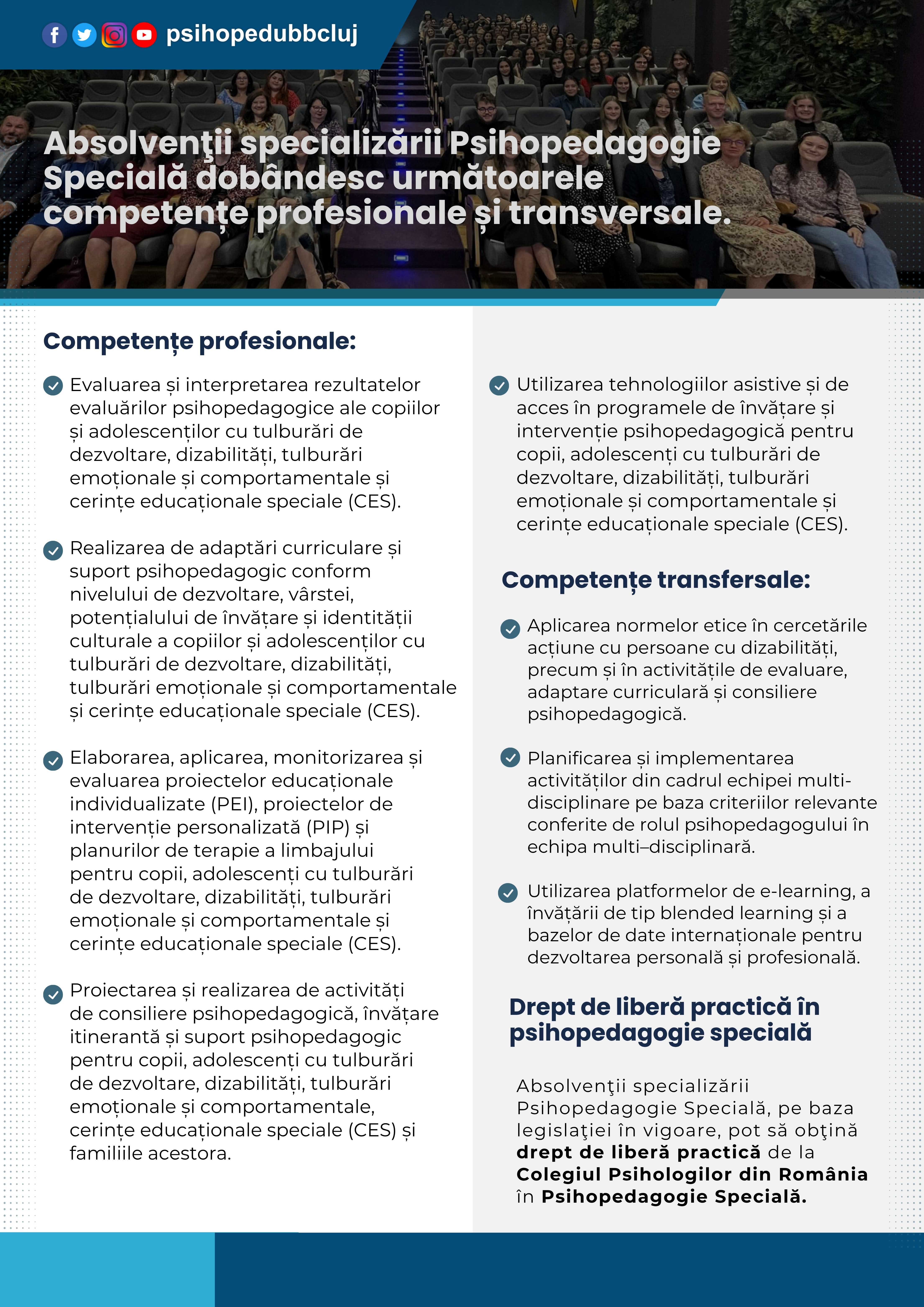 - Absolventul cunoaște normele competențele și treptele profesionale privind dreptul de liberă practică în psihopedagogia specială.